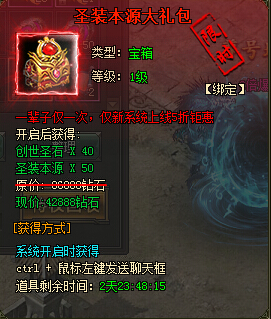 礼包是有时限的,一辈子仅一次,仅新系统上线5折钜惠,错过了这三天就再也没有了,玩家如果暂时没有钻石开启礼包,可以暂时将礼包放在邮件中,等有足够的钻石了再开启。一定要及时取出,不然邮件删除后将会后悔莫及。