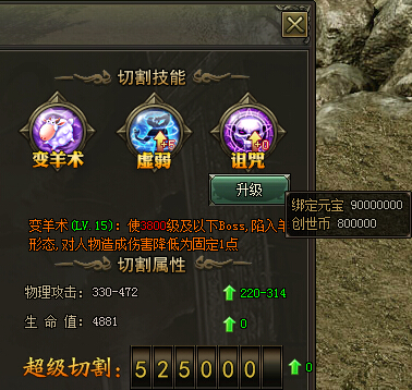 诅咒技能升级玩家可以在切割界面的第一个标签切割出进行升级,技能升级需要消耗大量的元宝和创世币,每次升级切割等级+1,在配合满价切割技能,即可是洪荒和鸿蒙boss进入虚弱状态。