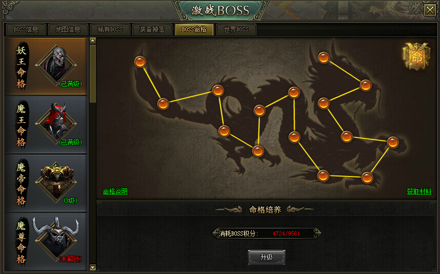 创世玩家在游戏vip等级达到15级时,将会开启boss命格系统,玩家可以在激战BOSS-BOSS命格界面查看BOSS命格状态。通过消耗BOSS积分,进行培养boss命格,每种等阶的boss命格一共15级,升级满了之后,将会开启下个等阶的boss命格。