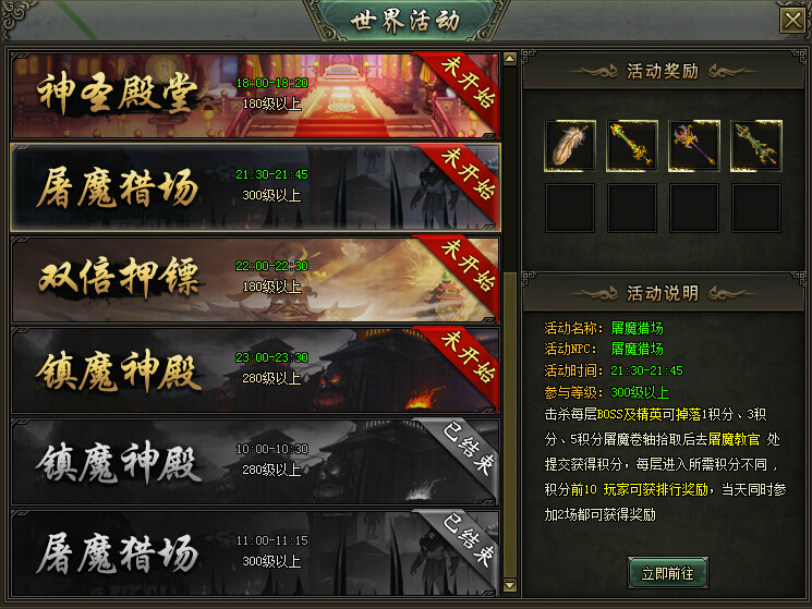 在每周二、四、日11:00-11:15、21:30-21:45开启屠魔猎场活动,玩家主要是收集boss掉落的屠魔积分交给教官,那么如何快速提交屠魔积分呢?