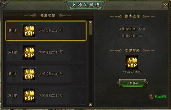 4.挑战奖励:每成功挑战1波,克领取一次大师经验奖励,副本结束后可以在进入界面领取