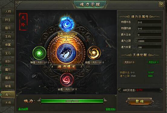 2)天魂、地魂、命魂、神魂各提升10级,可将魂力觉醒提升1阶