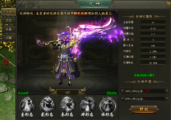 6.属性转化:未变身状态下,化神物理防御、最大生命、生命恢复、暴击力、pk减伤属性按一定百分比加成至人物身上
