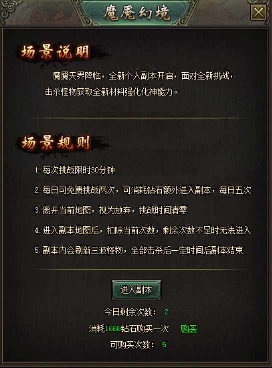 2.每日可免费挑战两次,课消耗1888钻石额外进入副本,每日五次