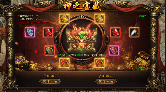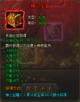 4.个人累计探宝次数达到300次可额外获得神之宝箱一个,个人累计探宝次数不会清零