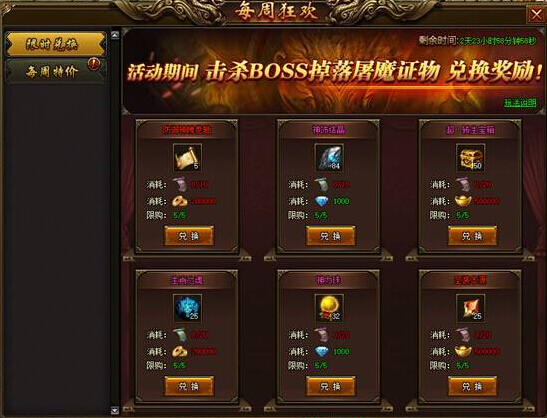 网页游戏创世中,开服大于等于8天的区服,每周一到周三开启每周狂欢-限时兑换,活动期间,击杀BOSS掉落屠魔证物,兑换奖励。