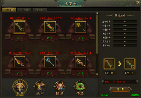 1.图鉴共分为武器、战甲、防具、饰品四个类型