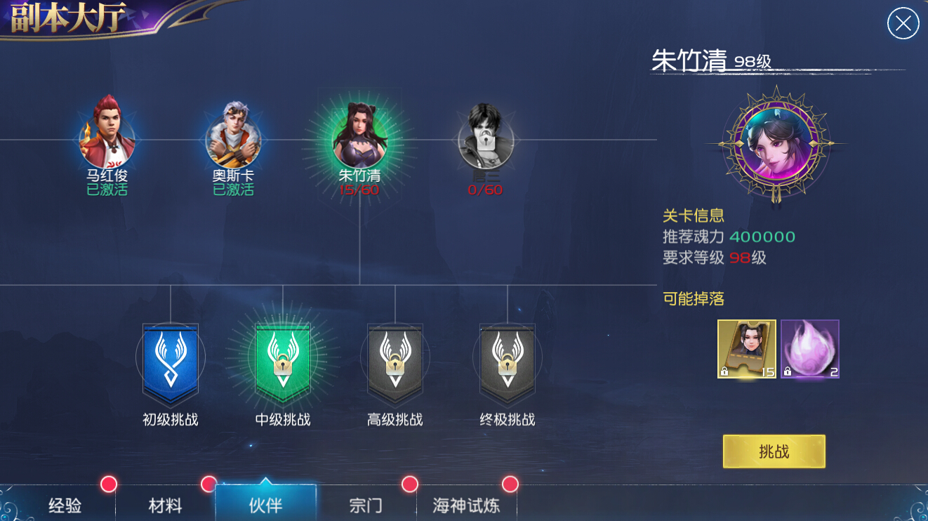 3.完成全部副本挑战可以在伙伴副本界面进行激活伙伴。