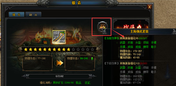 强化消耗黑铁矿石和铜钱,黑铁矿石通过挖矿、商城购买和行会秘境获得;
