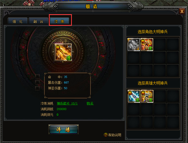淬炼消耗神兵碎片,锁定属性消耗绑定元宝(淬炼时属性不变)。
