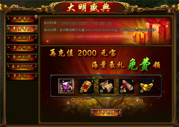 【活动说明】:每天充值2000/20000/50000元宝,即可领取相应的充值奖励!