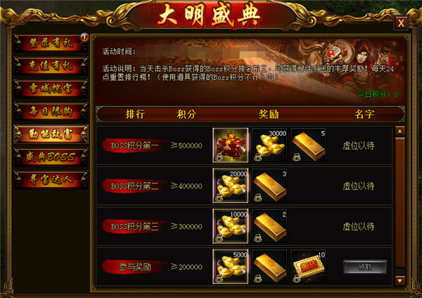 【活动说明】:当天击杀boss获得的boss积分排名前三,可获得邮件发送的丰厚奖励!每天24点重置排行榜!(使用道具获得的boss积分不计入内)