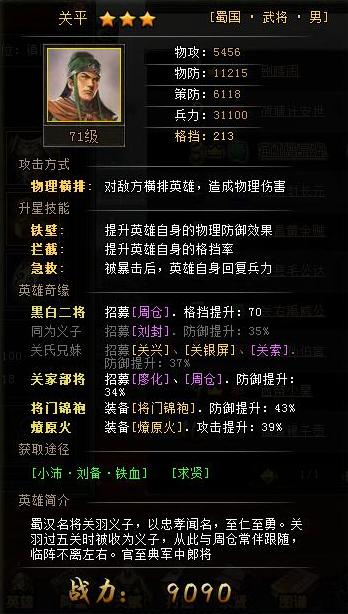 关平,金将里的盼盼防盗门,玩他爹你得花2000,玩他只需要一顿麻辣烫。物防成长高,兵力成长也不错,铁壁和拦截都是很常规的前排技能,急救也是他硬起来的资本。V5以下前期闪避流难玩,关平必须搞,而且是你想搞就能搞,小R非R也是玩两三天就能刷出来了,奇缘也很轻松开到4条。