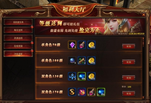 在新服开启第一天,将会开启冲级盛宴活动。玩家达到指定等级条件,可以领取等级礼包。每个等级的全服礼包数量是固定的哦~只有率先达到等级要求的玩家才可以领取!