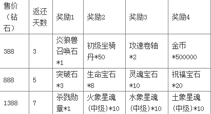 首充礼包内容:首充武器礼包(三职业4阶2星武器三选一)*1、永久经验加成BUFF*1、四阶双卓越防具礼包*1、灵魂宝石*4、祝福宝石*10、新手礼包。