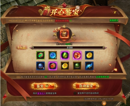 (3)本次活动最多可以获得20次大奖,若鉴宝时未抽到大奖,则会增加10点幸运值,当幸运值达到350时必定获得大奖。获得全部大奖后,将不能再继续鉴宝;