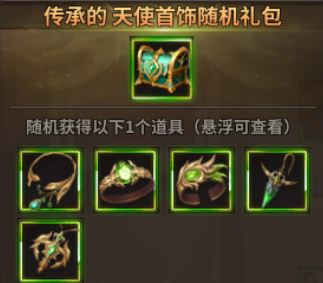 (1)传承的 天使首饰随机礼包:传承的天使首饰随机礼包可以随机,使用之后可以随机获得传承的 天使首饰X1