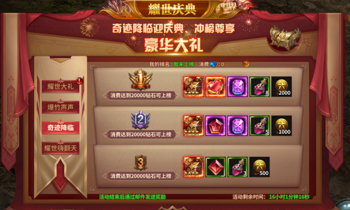 (2)活动结束时,将根据排行榜实时数据,为本服消费排行榜中排名前三的玩家发放奇迹降临大奖,奖励将在活动结束后通过邮件进行发送;