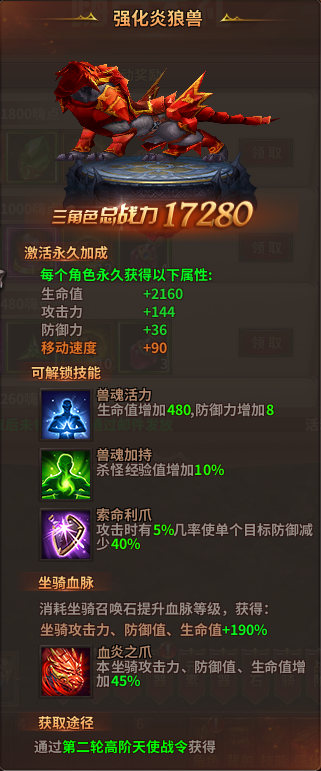 (2)强化炎狼兽召唤石:可激活坐骑强化炎狼兽,激活后三角色总战力至少增加17280!