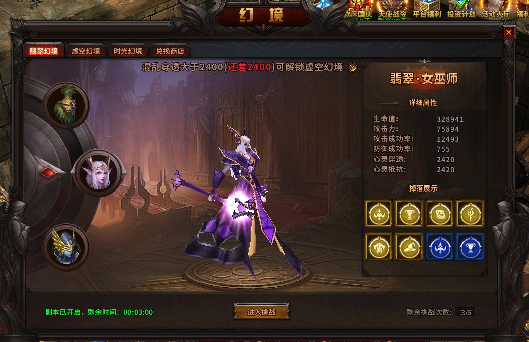 1) 幻境副本共有3层,副本开启后可进入翡翠幻境,当达成指定属性要求后可进入虚空幻境和时光幻境;