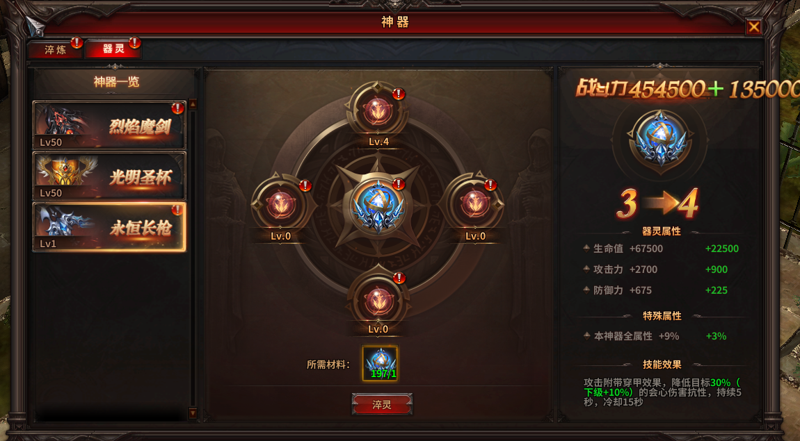 在神器激活后,消耗对应的核心器灵材料,即可提升神器的核心器灵等级,对本神器攻防血属性进行放大,并获得强力器灵技能;