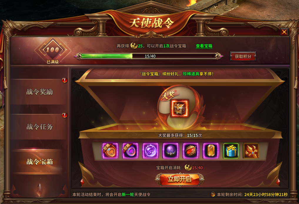 1) 天使战令满100级时,将会开启[战令宝箱]功能;