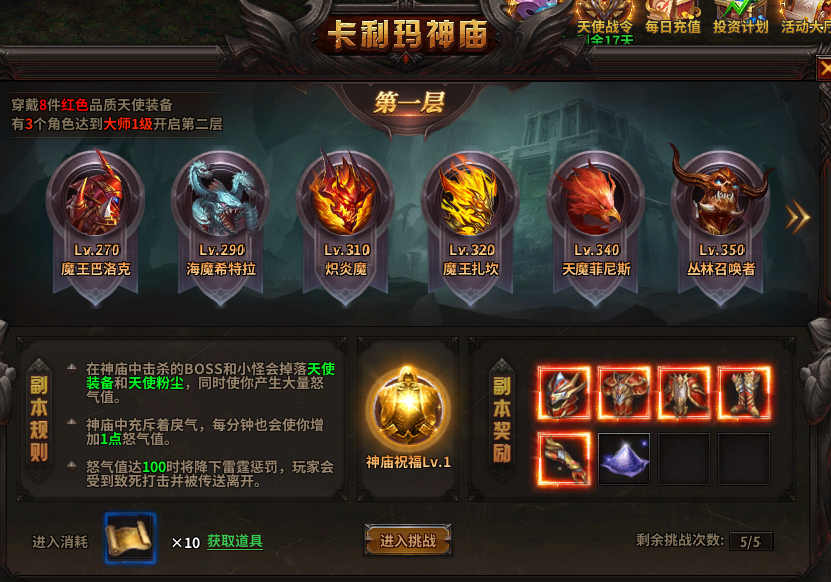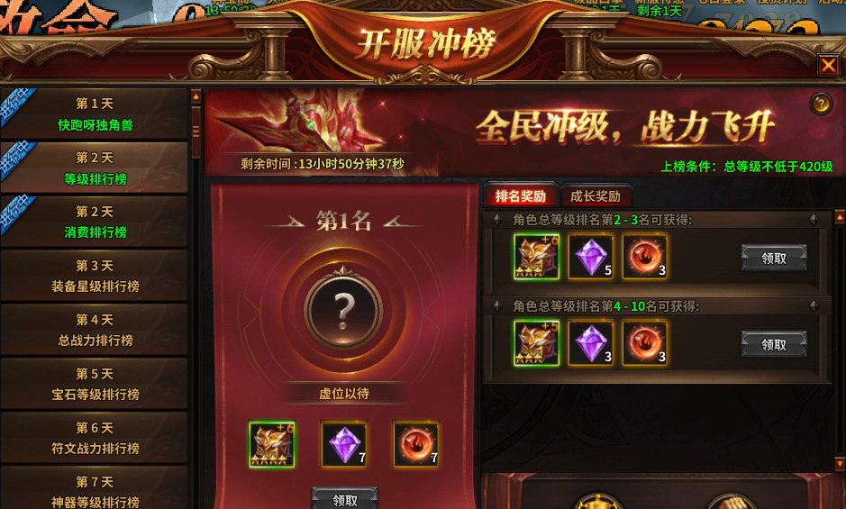接下来要注意的是,第一个排行榜奖励是开服第二天的等级排行榜,在不多花钱的情况下,第一天的恶魔和血色额外次数就一定要买满,不然第二天被消费略低的偷鸡就亏大了。