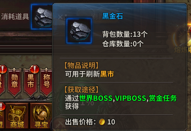 黑市中的商品是可以刷新的,如果对当前黑市中的商品不满意,可以通过点击右下角的刷新按钮,通过消耗黑金石来刷新当前黑市中的全部商品。黑金石可以通过击杀VIP BOSS和世界BOSS、以及赏金任务来获得。玩家可以通过反复刷新和购买卓越装备宝箱以及各种宝石来飞快的提升战斗力。