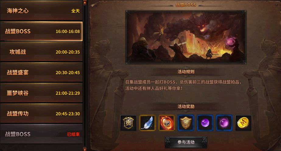 战盟BOSS是战盟活动时刷新的,每天两次,分别是上午和下午。由战盟成员组成的小队一起完成击杀,击杀过程中会掉落金币和宝箱,完成击杀后可以在拍卖行中竞价购买自己想要的道具。