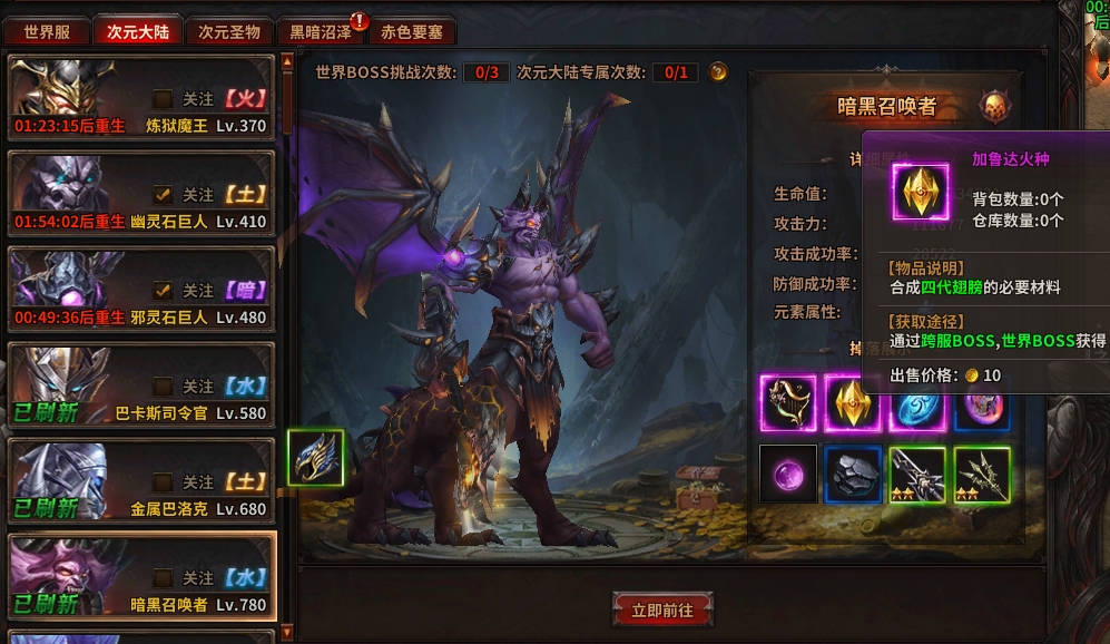 次元大陆BOSS主要产出元素装备、神鹰火种、加鲁达火种、防具套装石、黑金石、经验丹、各阶星级装备,其中加鲁达火种是合成顶级四代翅膀的必须材料,非常稀有。