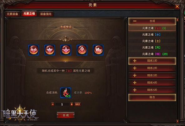元素之魂有火、水、土、风、暗五种,它们通过元素之魂碎片合成而来,每一颗元素之魂都可以为玩家带来属性加成。同时,每种元素之魂分为五阶,玩家可以消耗元素符文等材料,对元素之魂进行精炼,若精炼成功,将提升精炼等级和精炼属性效果。若精炼失败,可能会使精炼等级下降。而使用祝福材料可以提升精炼成功率,来避免等级下降;在元素之魂精炼等级+7后,可消耗相同类型、等阶、精炼的元素之魂进行融合,成功后元素之魂等阶提升,随机生成一条新精炼属性。