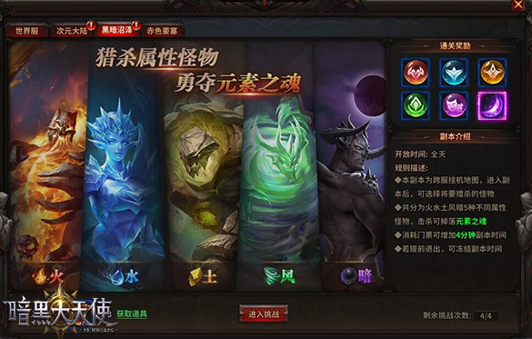 在玩家3角色达到380级后,玩家可以进入世界跨服地图—黑暗沼泽,每个玩家在副本的时间有限,但可凭借门票增加副本时间,若提前退出可冻结副本时间。玩家在副本中通过击杀不同的元素之灵,可以获得元素之魂以及碎片等材料。