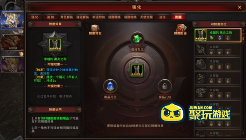 在魔晶孔位镶嵌魔晶并且在魔核孔位镶嵌魔核即可成功附魔;