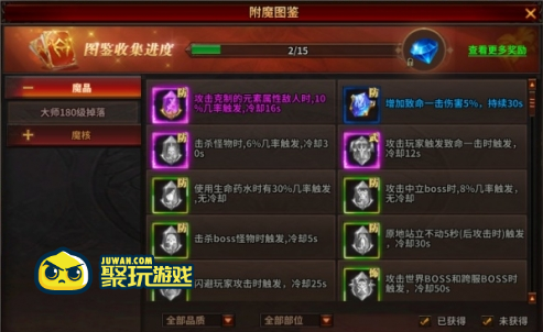玩家可通过附魔图鉴查看全部魔晶和魔核,且达到一定收集进度时可以领取图鉴奖励!