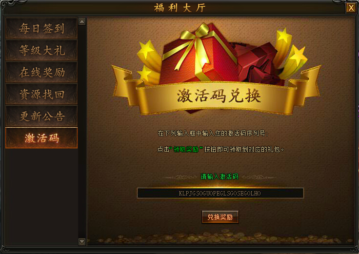 玩家在获得礼包激活码后,可以在游戏中的福利大厅中进行兑换奖励。玩家复制激活码黏贴在激活码界面的输入框中,点击兑换奖励,即可兑换成功。