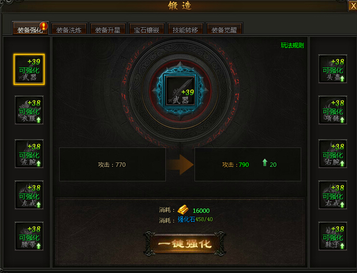 1.强化需要消耗金砖,可大幅提升穿在该部位的装备属性,强化等级越高,强化属性越强。