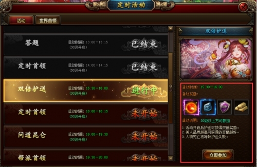 护送的时候注意时间. 15:30—16:00,这个时间段护送给的奖励为双倍。双倍的经验和道具还有礼金,绝对的超值啊!