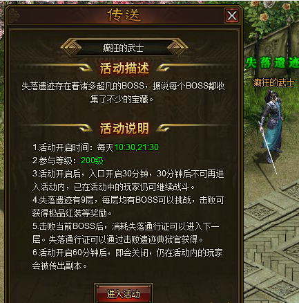 需要参加该活动的玩家,就要把握好活动时间,前往圣月王城找到NPC“癫狂的武士”对话,传送进入活动地图。活动开启后,入口开启30分钟,30分钟后不可在进入活动的,而已经在活动地图的玩家,仍然可以继续战斗。