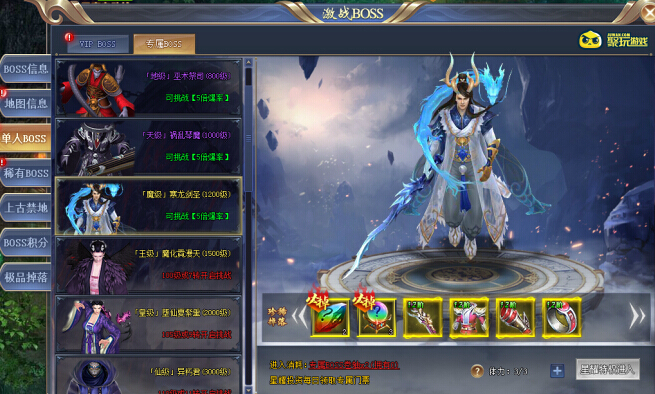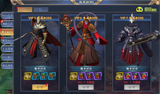 只有VIP用户才能挑战的BOSS!VIP BOSS为个人副本,安全打BOSS,从容捡装备!VIP等级越高,可以挑战的BOSS也就越强,掉落的装备也就越极品,各位一定要抓紧机会,激活VIP,挑战属于自己的BOSS,掉落更多更极品的神装!