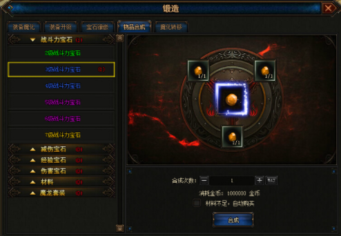 物品合成功能中,可以让玩家进行宝石和各类材料的合成操作