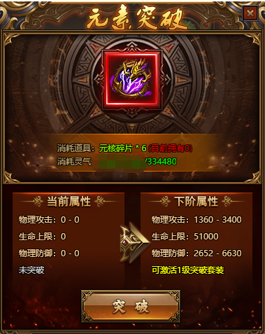 1.穿齐一套11阶以上的元素核心即可开启元素突破系统;