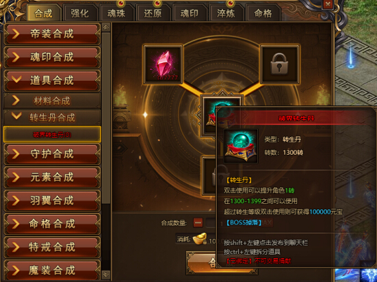 玩家转生上限扩到1400,可消耗7777转生碎片合成“破界转生丹”进行1300转以后的转生;