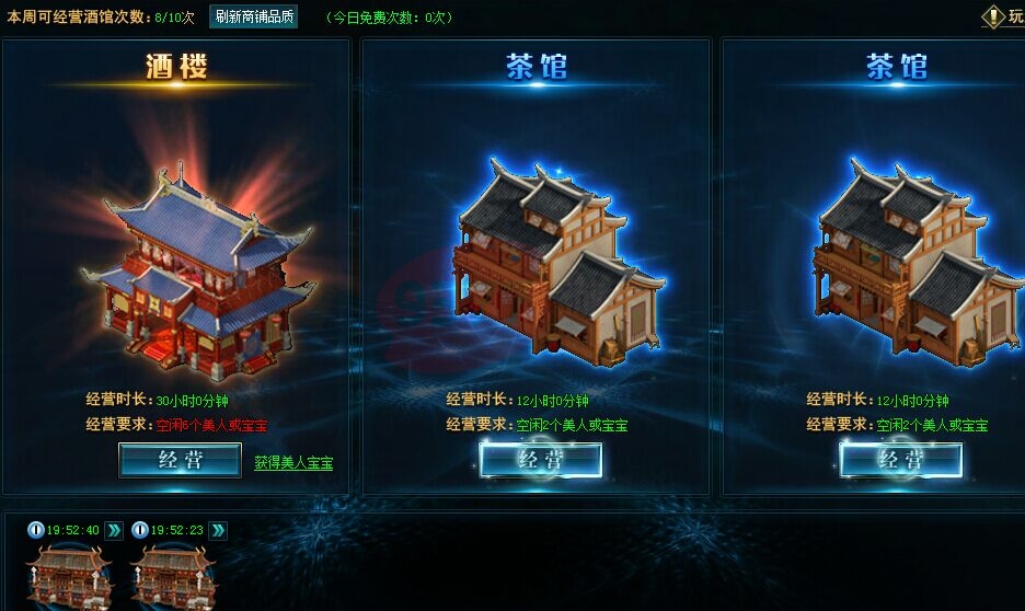 每周每位玩家可派遣人员经营店铺10次。此外,玩家每天可免费刷新店铺的品质两次,之后可以消耗金币继续刷新。