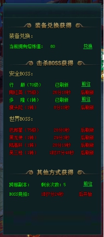 装备获取:装备可以通过熔炼值兑换,可以通过BOSS掉落,通过跨服获得,通过BOSS竞拍获得。