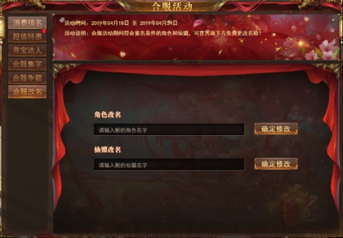 合服活动期间符合重名条件的角色和仙盟,可在界面下方免费更改名称!