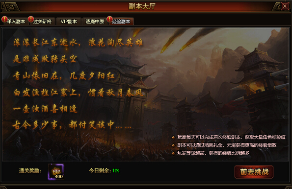 扫荡经验副本可以获得至少百万经验,且人物等级越高,得到的经验越多。玩家每天可扫荡2次经验副本,扫荡过程中使用礼金、元宝可使副本经验翻倍。经验副本在人物等级达到60级且玩家完成相应主线任务后自动开启。