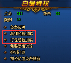 激活白银特权可解锁离线经验加成和打怪经验加成功能,这样玩家就可以在离线时和打怪中获取更多经验。白银特权是永久特权,只需激活一次就可以永久使用。另外激活白银特权还能解锁免费传送功能,可让玩家进行任务更方便。