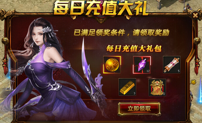 每日充值元宝数达到相应金额即可领取对应奖励。