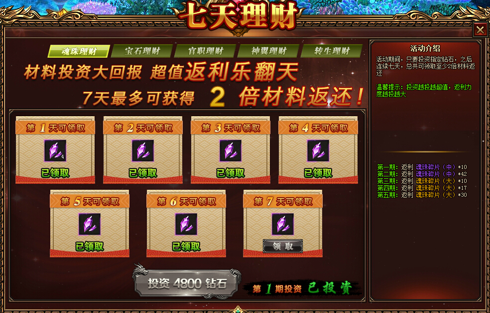 七天理财分为魂珠理财、宝石理财、官职理财、神翼理财和转生理财。每个投资都仅需投资4800钻石,魂珠理财第一天可以领取魂珠碎片(中)*4,之后6天每天领取1个;宝石理财第一天可以领取宝石碎片(中)*4,之后6天每天领取1个;官职理财第一天可以领取功勋卷轴(大)*4,之后6天每天可以领取1个;神翼理财第一天可以领取灵羽*40,之后6天可以领取灵羽*40;转生理财第一天可以领取高级转生丹*10,之后6天每天可以领取1个。