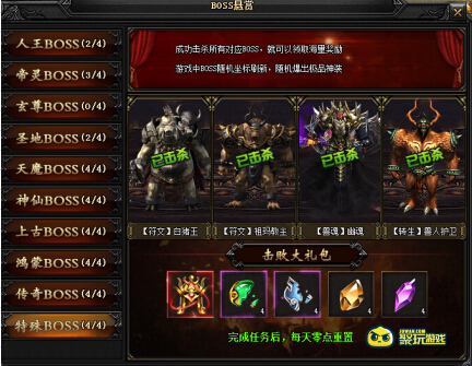 BOSS悬赏活动规则:玩家成功极少每个级别的4个BOSS即可领取对应的奖励,完成任务后,每天零点重置。游戏中的BOSS随机坐标刷新,随机爆出极品装备。